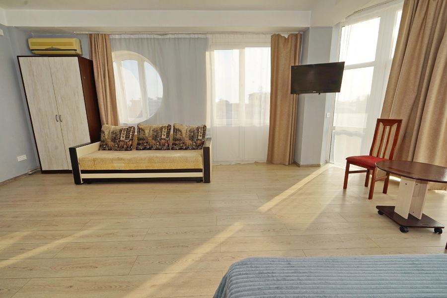 Удобства: стол и стулья на балконе, вешалки, зеркало, посуда, постельное белье, полотенца, санузел совмещенный.